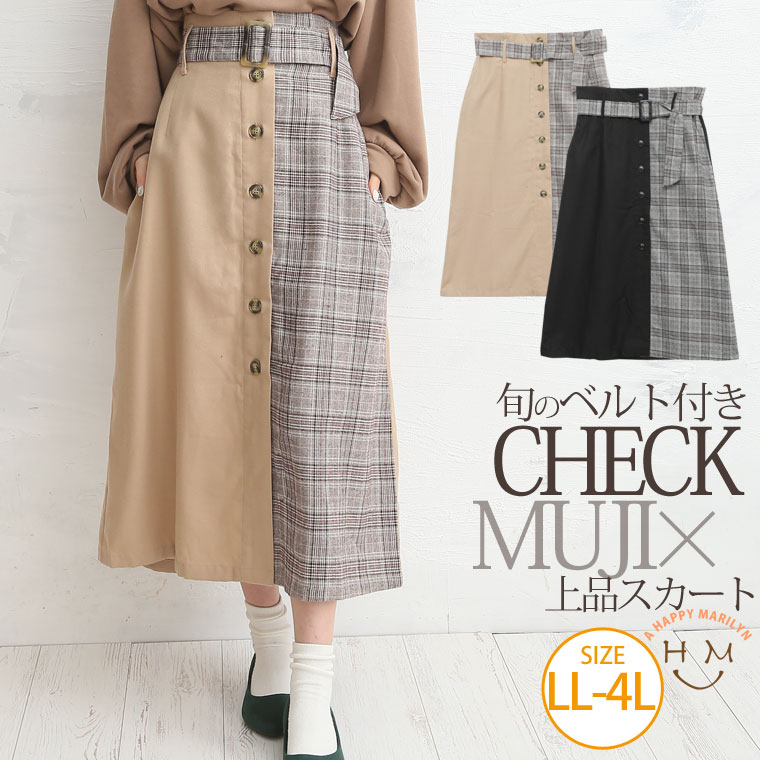 大きいサイズ ベルト付き フロント 釦 ロング丈 切替スカート ハッピーマリリン